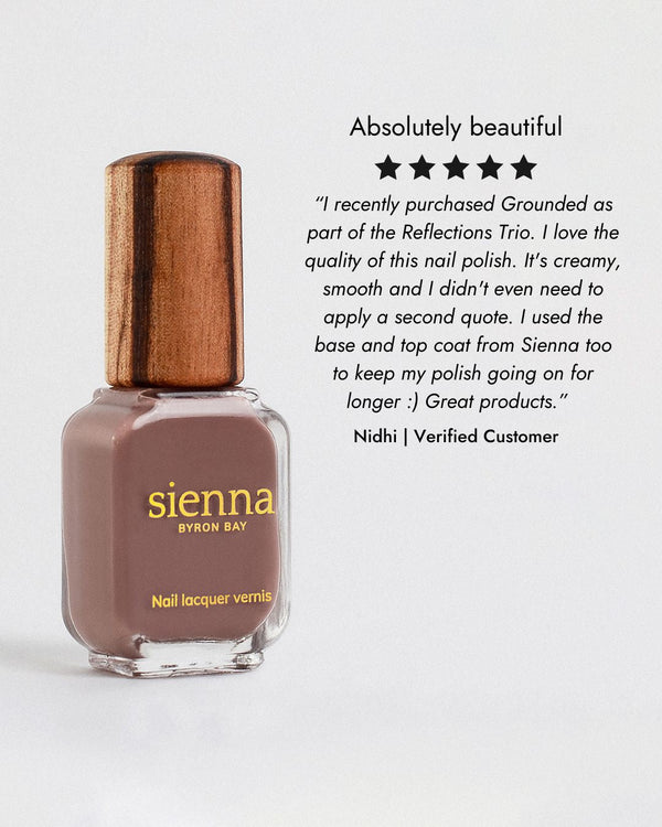 Sienna Nail Polish Grounded is a warm mylk chocolate crème that feels as comforting as a cup of hot cocoa. Rich, smooth, and deeply wearable, this earthy brown shade brings a sense of calm and balance while delivering a flawless, full-coverage finish. Perfect for everyday elegance or a cosy, polished look, Grounded suits all seasons and skin tones.